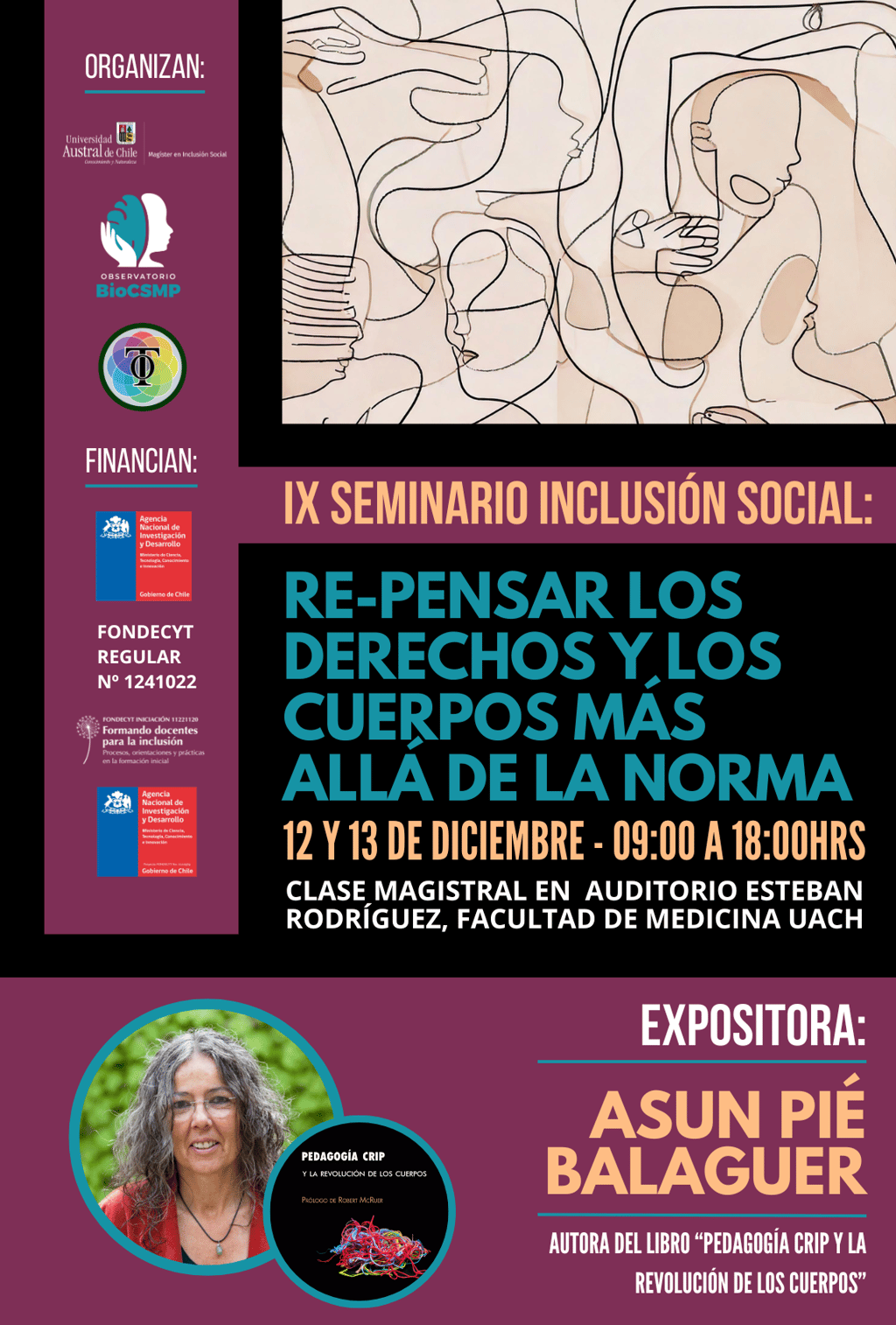 Para tales efectos, tendremos dos charlas magistrales a cargo de las expositoras Asun Pié Balaguer, Dra. en Pedagogía; profesora e investigadora de los Estudios de Psicología y Ciencias de la Educación de la Universitat Oberta de Catalunya (UOC); y experta en estudios sobre discapacidad, quien presentará su último libro, Pedagogía Crip y la Revolución de los Cuerpos y la académica Andrea Lira, Dra. en Curriculum y Enseñanza y profesora de la Universidad de Magallanes, quien actualmente se encuentra trabajando en la línea de Justicia Restaurativa.